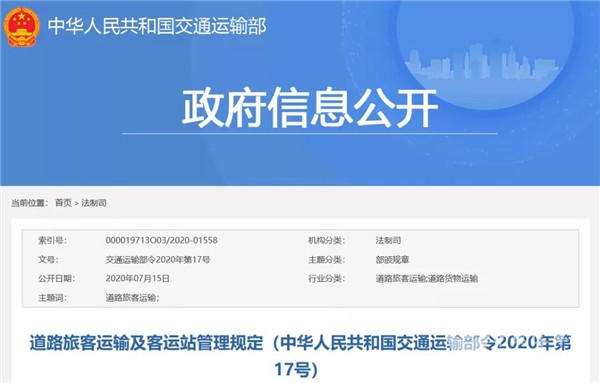 2020年7月15日,交通運(yùn)輸部發(fā)布了《道路旅客運(yùn)輸及客運(yùn)站管理規(guī)定(中華人民共和國交通運(yùn)輸部令2020年第17號)》。